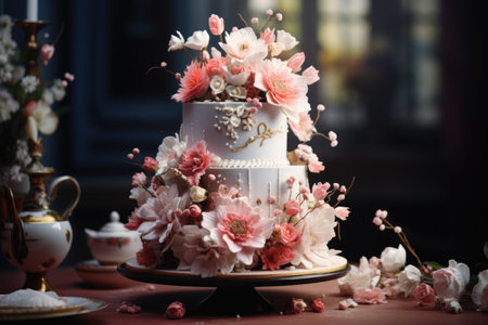 Elegant pink floral cake on lace tablecloth in cherry blossom garden. That the image is generated using AI.