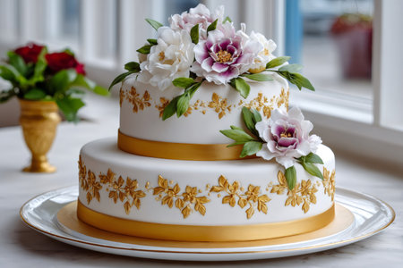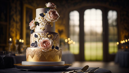 Tiered wedding cake decorated with gold icing patterns and sugar flowers, ready for celebration