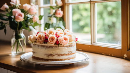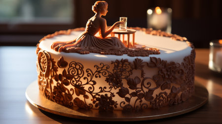 Realistic cake in neutral colors with warm lighting and high detail creates a cozy atmosphere in a restaurant captured in a medium shot with no people. Generative AI Generated