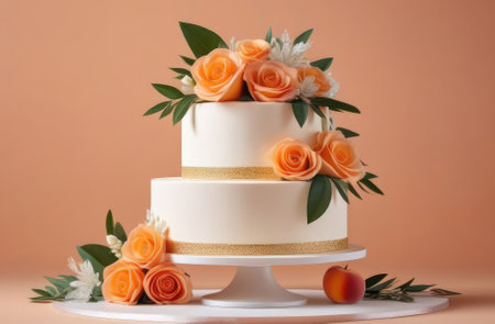 wonderful white wedding cake with two tiers decorated with roses and leaves on peach background