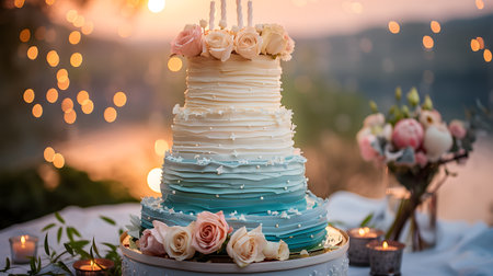 Delicious wedding cake with flowers and candles in the evening light.