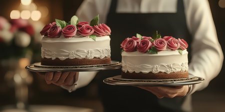Elegant waiter presents beautifully decorated cakes with pink roses during a special event in an upscale venue