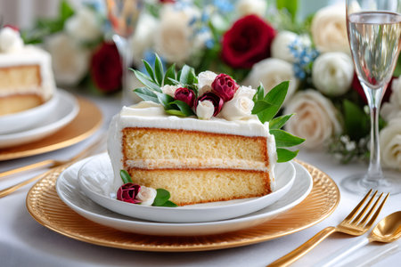Delicious slice of vanilla wedding cake decorated with white frosting and flowers