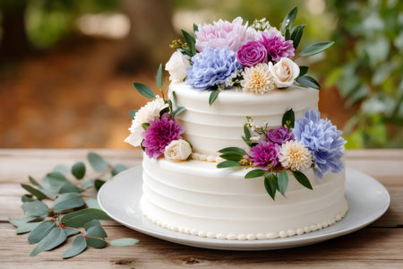 Beautiful two-tiered wedding cake decorated with colorful flowers sitting on a wooden table, perfect for a romantic celebration