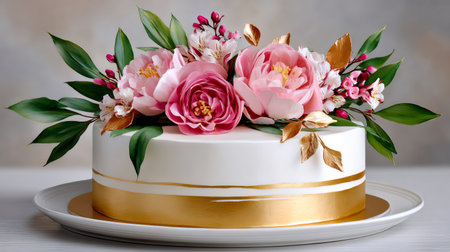 White cake featuring pink peony arrangement, fresh green leaves, and elegant gold design