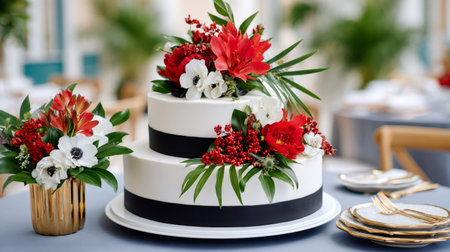 Luxury wedding cake, exclusive high-end design, beautifully decorated professional multi tier premium cake as main dessert for exquisite wedding celebration. Generative Ai.
