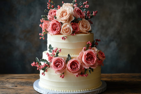 Wedding cake decorated with multicolored roses on a wooden table