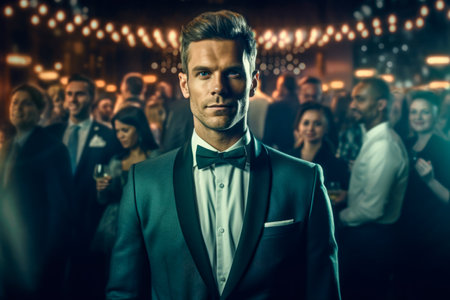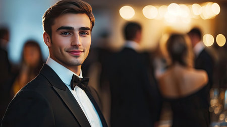 A young man dressed in a classic tuxedo smiles confidently at a glamorous event, surrounded by softly blurred figures and twinkling lights.