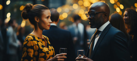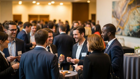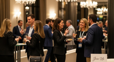 Professionals gathered in a modern venue for a corporate networking event with warm ambient lighting and stylish decor. High quality photo