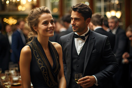 Group of beautiful young people in formalwear communicating and smiling while spending time on luxury party : Generative AI