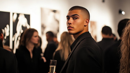 A young man stands at an art gallery looking off-camera, dressed elegantly, holding a glass, while guests socialize in the background.