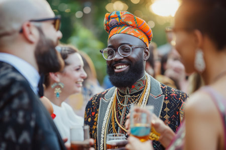 A man wearing a turban and glasses smiles warmly as he interacts with a diverse group of individuals, Wedding guests from diverse cultures enjoying at the reception, AI Generated