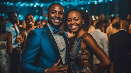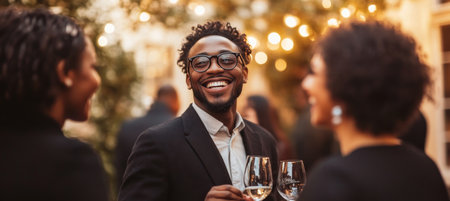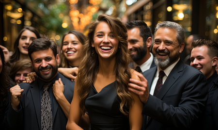 Group of charming party makers celebrating joyfully at a stylish event in an elegant venue during evening hours with vibrant expressions and fashionably chic attire