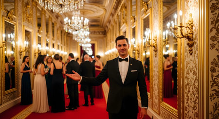 Elegant man in tuxedo welcomes guests to a luxurious event in a grand hallway with chandeliers and ornate gold decor, creating a formal and glamorous atmosphere