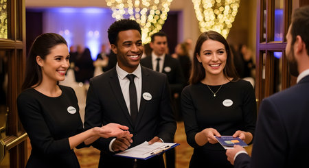 A team of three friendly and professional event volunteers smiles as they welcome a guest at a formal conference or gala. Dressed in black, they check in the attendee, with one staff member handing over an entry pass or name tag. The warm, inviting atmosphere is enhanced by the elegant, well-lit background.