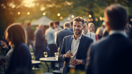 Entrepreneur wearing a badge, laughing and networking with colleagues at a gala dinner in a luxury venue