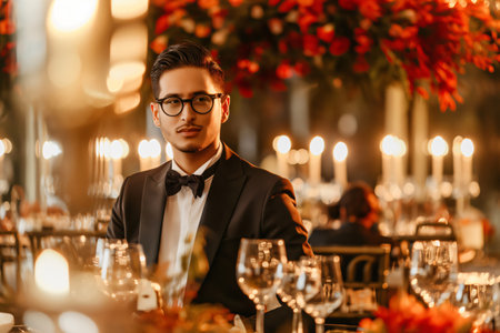 Event planner is wearing a tuxedo and sitting at a table during a gala dinner in a luxurious ballroom