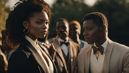 Diverse group of friends at gala on rooftop. Group of young people at gala luxury party. The scene has overall soft focus and intentional film grain wearing suits and dresses elegant