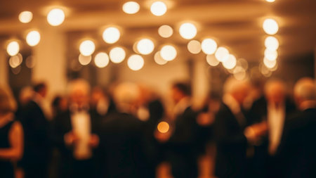 Fuzzy shapes of attendees mingled under the soft glow of the rooms chandeliers