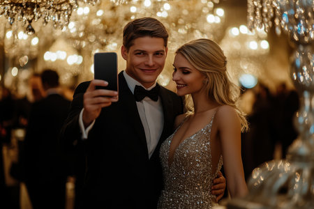A couple dressed in formal attire captures a selfie at a luxurious event filled with dazzling lights.
