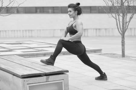 Sport woman squatting for warm up before fitness training. Athlete woman doing stretching exercise in city street near multistorey buildings.