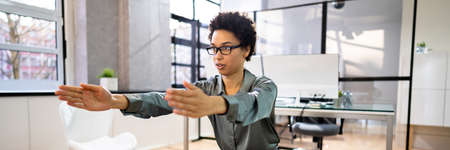 Workout concept. Sporty african american lady doing deep squats exercise, training over blue background, panorama