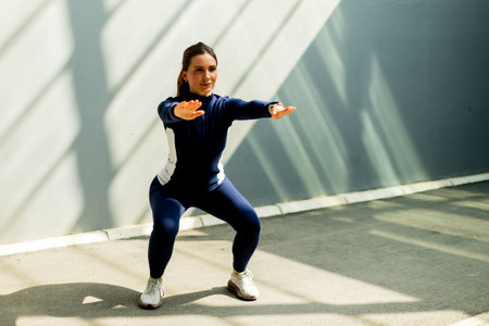 A focused woman engages in an energetic squat routine, displaying determination under the warm sunlight that filters through tall windows.
