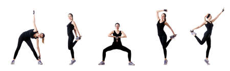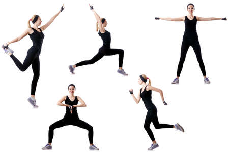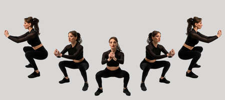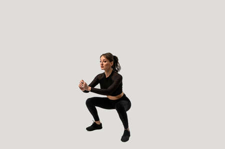 Full length portrait of a young fitness woman doing squatting isolated on a white background