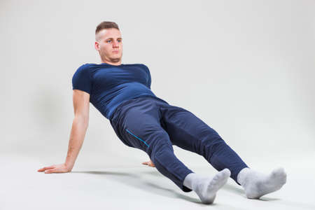 Young man preparing muscles before training. Muscular athlete exercising crossfit. Fit man stretching. Professional sportsman warming-up. Workout lifestyle concept.