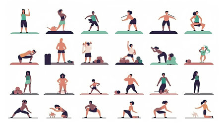 Diverse group performing various exercises outdoors, wearing casual athletic clothing and listening to music.