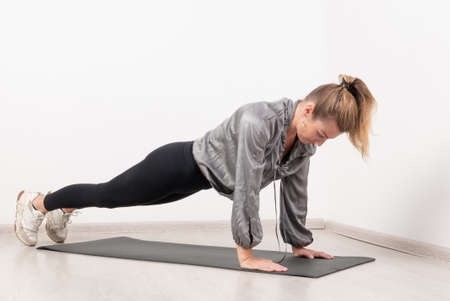 Sport. Young fit woman doing plank. Sporty and strong girl exercising. Fitness exercising. Side view. High quality photo