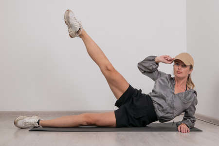 Slim beautiful woman warming up, working out, doing side lunges, exercises for legs, hips and buttocks,