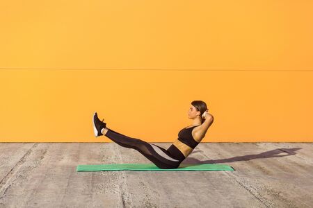 Young sporty attractive woman practicing yoga, doing paripurna navasana exercise, balance pose, working out, wearing sportswear, black pants and top. Outdoor, orange wall background, sport concept