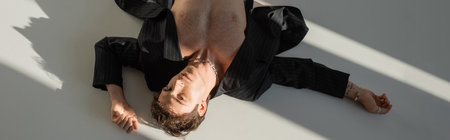 top view of shirtless man in black blazer and silver necklace lying and looking at camera on grey background, banner
