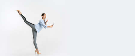 Fit woman athlete training on the blue sky background. The concept of a healthy lifestyle and sport. Individual sports recreation. Social media post idea.