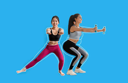 Happy asian and caucasian young ladies in sportswear doing exercises