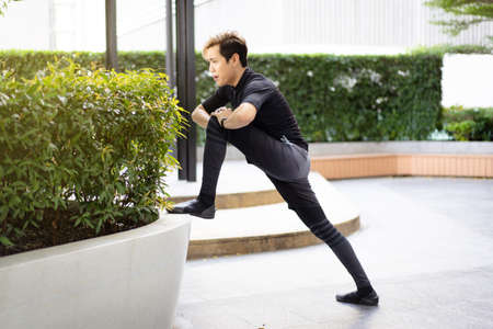 Happy Asian young sportsman doing a lower and upper body stretching before making an exercise in a park, stretching and workout concept. Sport man making a cardio and weight training workout.