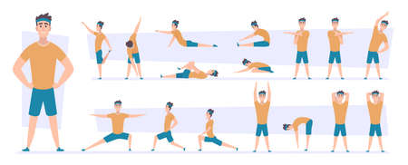 Sport stretching. Muscles flexibility poses workout movements action for recreation people exact vector colored illustrations