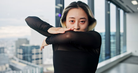 Dance, portrait and woman in studio for choreography, movement or performance with window for view of Tokyo. Art, creative and talent with confident Japanese dancer in class for theater recital