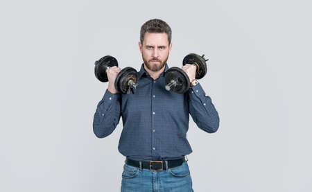 Caucasian man doing exercises with two dumbbells while standing in the studio, isolated on white background
