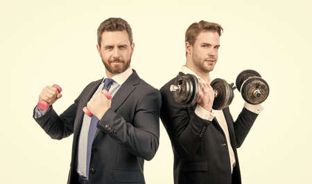 Strong and weak businessmen do dumbbell workout with hand weights, business competition