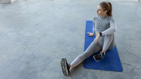 Young caucasian blond fitness woman sitting on a mat on a concrete floor. healthy lifestyle