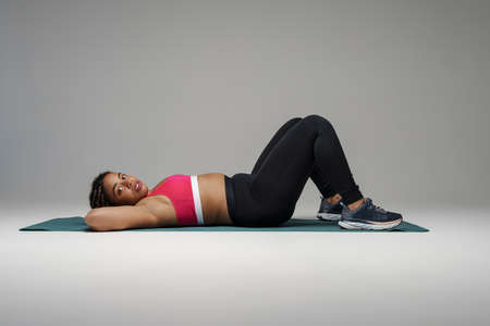 Smiling young african bodypositive fitness woman over gray wall background exercising on a fitness mat