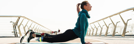 Young sportswoman with prosthesis doing exercise while working out on city bridge