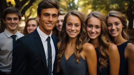 Family portrait of a group teenagers brothers and sisters smiling at camera in the park. Large family concept.