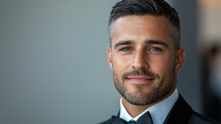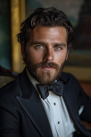 Portrait of a handsome man with a beard and mustache in a tuxedo