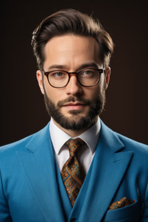Portrait of a Confident Young Businessman in Formal Suit with Glasses, Isolated on a Dark Background