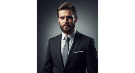 Portrait of a handsome man in a black suit with a beard.