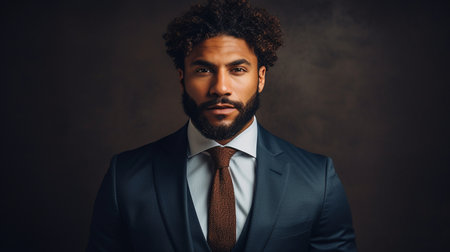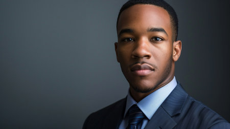 Black businessman 30s ai generated portrait image. Confident formal african american executive photography studio shot. Masculine business man picture photorealistic. Company concept photo realistic