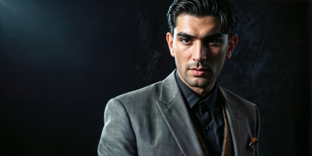 Businessman posing confidently against a dark background showcasing professionalism and charisma in a modern office setting during late afternoon hours